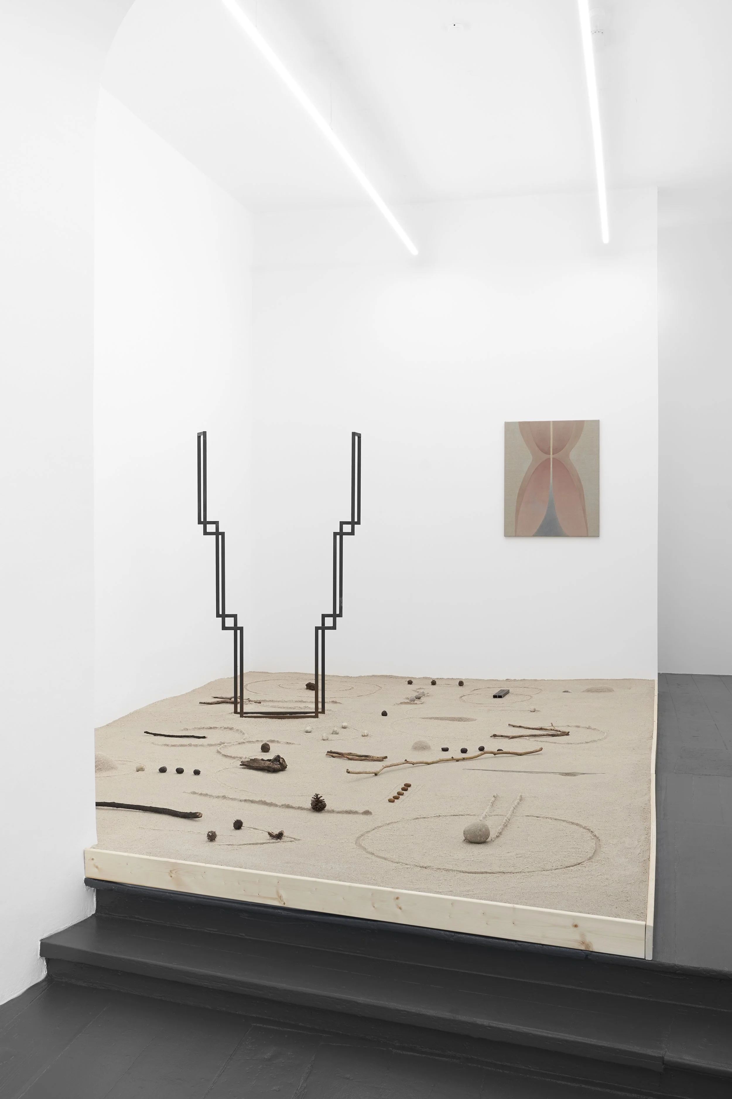 For this exhibition Garrard includes larger and more complex paintings alongside sculptures and an ephemeral installation. In comparison to her previous works the new paintings incorporate a dialogue of forms, interweaving a narrative within the painting. The dialogue is continued through a series of sculptures made from steel and wood, which in juxtaposition to the paintings appear heavy and weighted. The sculptures expand into the space itself and form a part of a site-specific installation combining quartz sand as well as found objects from Berlin which are positioned in specific relation to one another. In the back ground, the eerie sounds taken from the NASA space recordings of Venus, create an otherworldly trance-like drone. The exhibition acts as a visual and sonic exploration of vibration and consciousness through matter, combining genres and mediums in an exploratory practice that fore fronts nature as a power source for further inquiry.