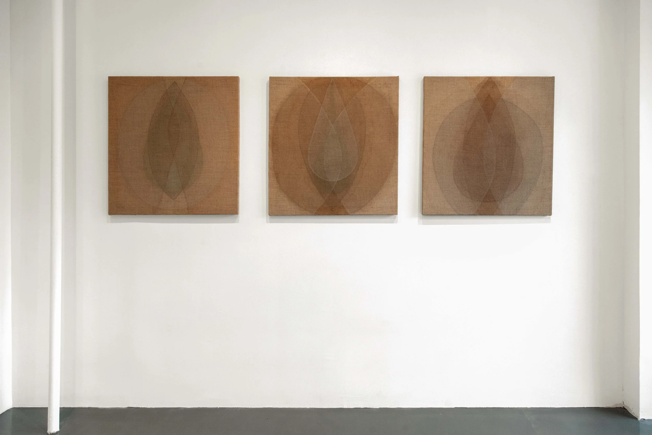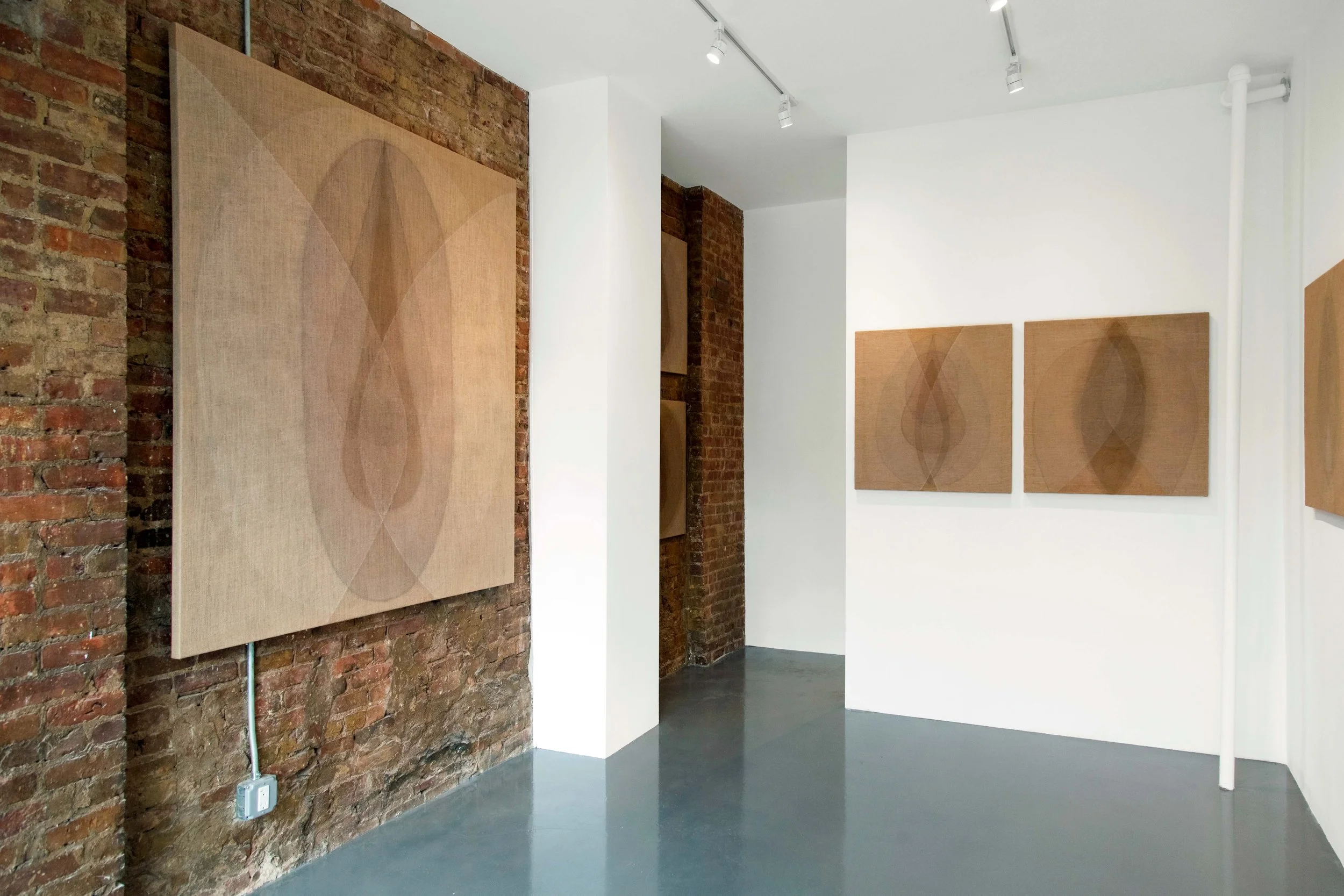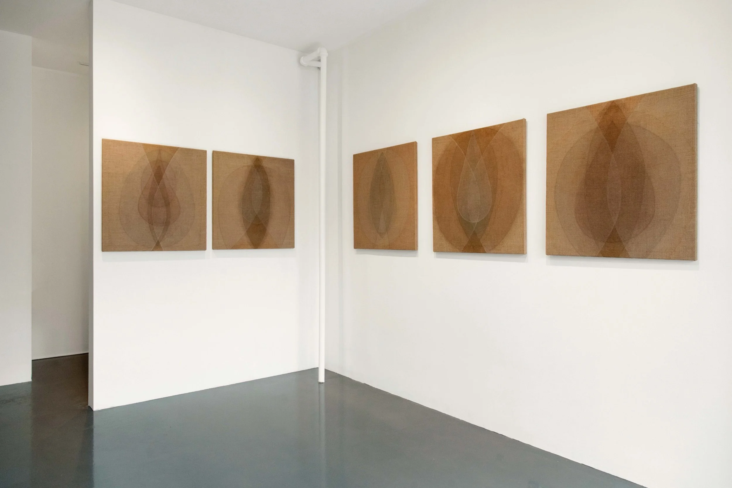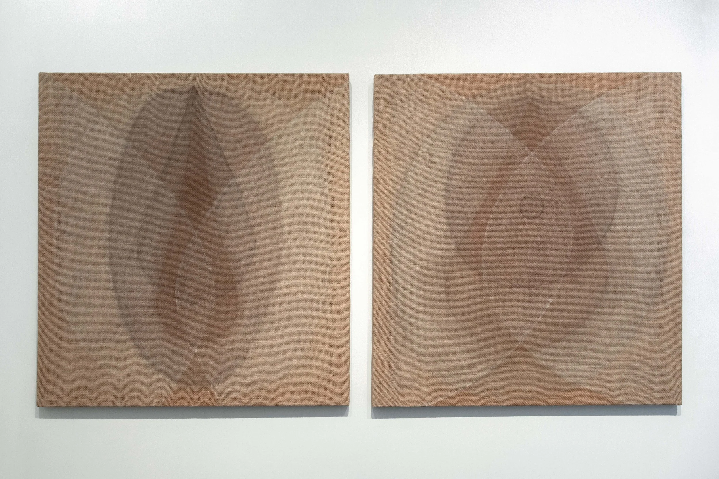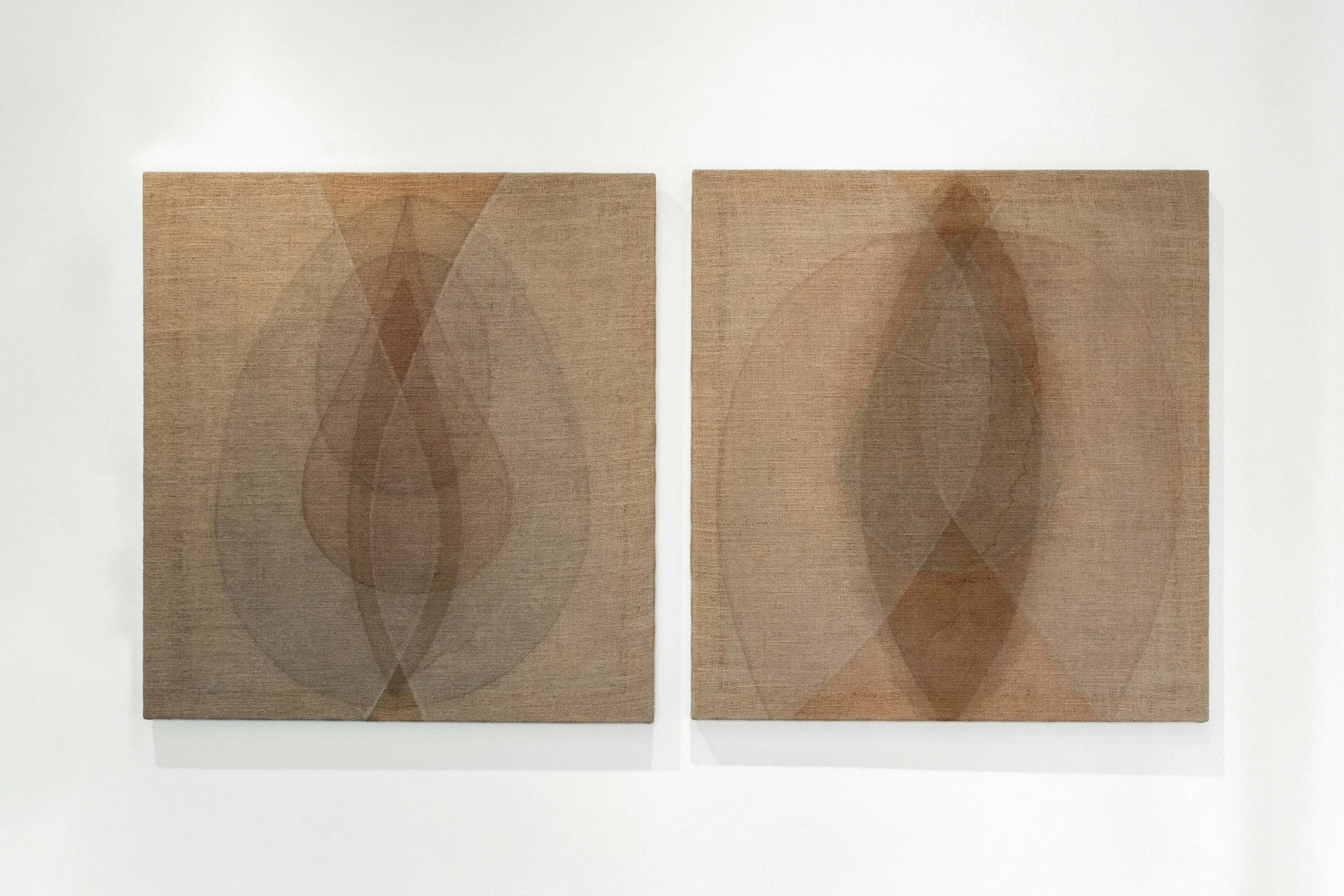 An emphasis on process and performative ritual, the creation and use of natural pigments, and the integration of the body all lie at the heart of Garrard’s painterly practice. Primal Forms reflects her continued research and experimentation with bodily geometry and the abstraction of the human form. The interlocking shapes in her paintings reflect primal elements that can be seen as both “primitive” and “tribal” as well as cosmic and universal. Garrard’s vocabulary of abstract organic forms is self-reflective, echoing her personal geometry, as her own physicality becomes the starting point of her practice. The paintings thus articulate a formal language abstracted from the proportions of the artist’s body. When making work related to the body, the relationship to the universal is paramount for Garrard, who states, “I see the human body as a microcosm, a seed containing all the geometric and geodesic measures of the cosmos, as a container for something infinite.” Created through a ritualistic and alchemical process, each canvas becomes a palimpsest of layered quartz, ash, green earth, mud and walnut, Garrard’s signature earth-based pigments which she makes by hand in her studio from natural materials collected during her travels. The resulting sensual intermesh transports the viewer into the realm of the unconscious, the primordial forms acting as contemplative spaces, openings beyond time and space. By placing herself within a broader metaphysical context, the body, for Garrard, becomes a vessel of transformation and inward contemplation, inviting us to question our place within the universe.