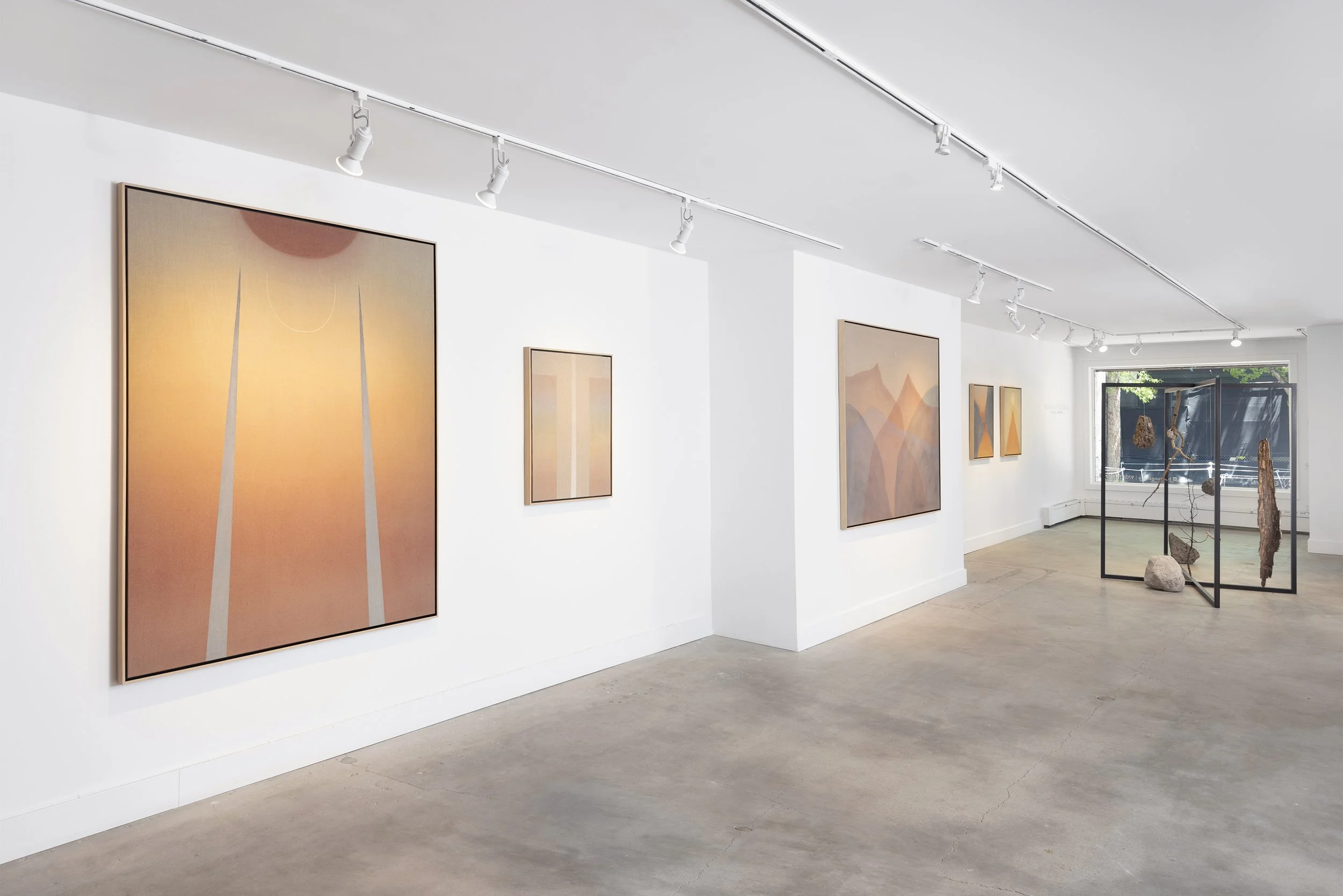 The paintings reveal inner structures of the external world: rocks, personally collected by the artist, are hand-ground and applied to raw linen canvas through a process of fine layering to create translucent washes of colour. The canvas becomes a physical register of place, a palimpsest of past experiences and a portal to the metaphysical landscape of memory.