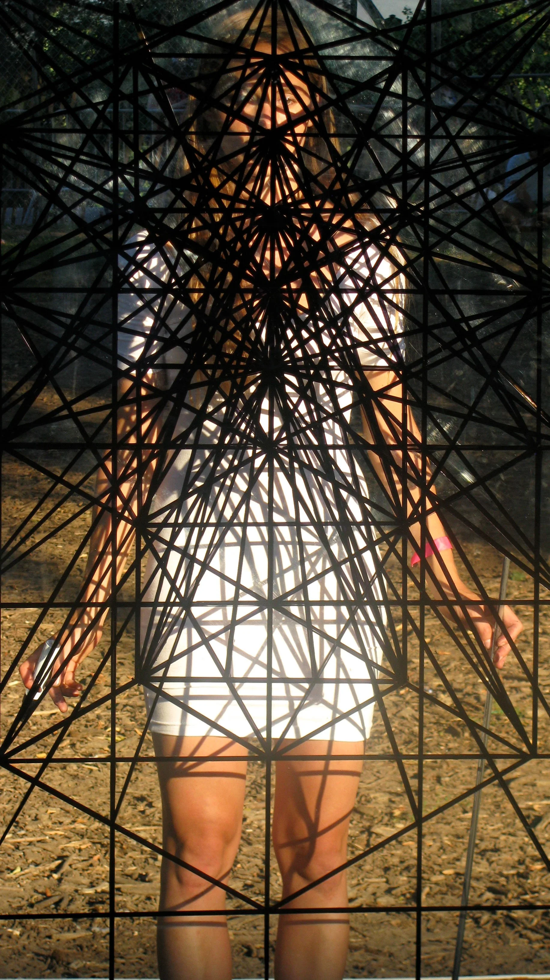 Geometric Void is the tangible remains of an eight-hour performance that took place at the Bruce High Quality Foundation's Field of Dreams, July 24th 2010. After mapping out my own fundamental geometric divisions onto a transparent sheet of Perspex, I use these as guides to develop more intricate patterns stemming from proportional relationships. I continue until the dense configuration of lines begins to obliterate my form completely from view.