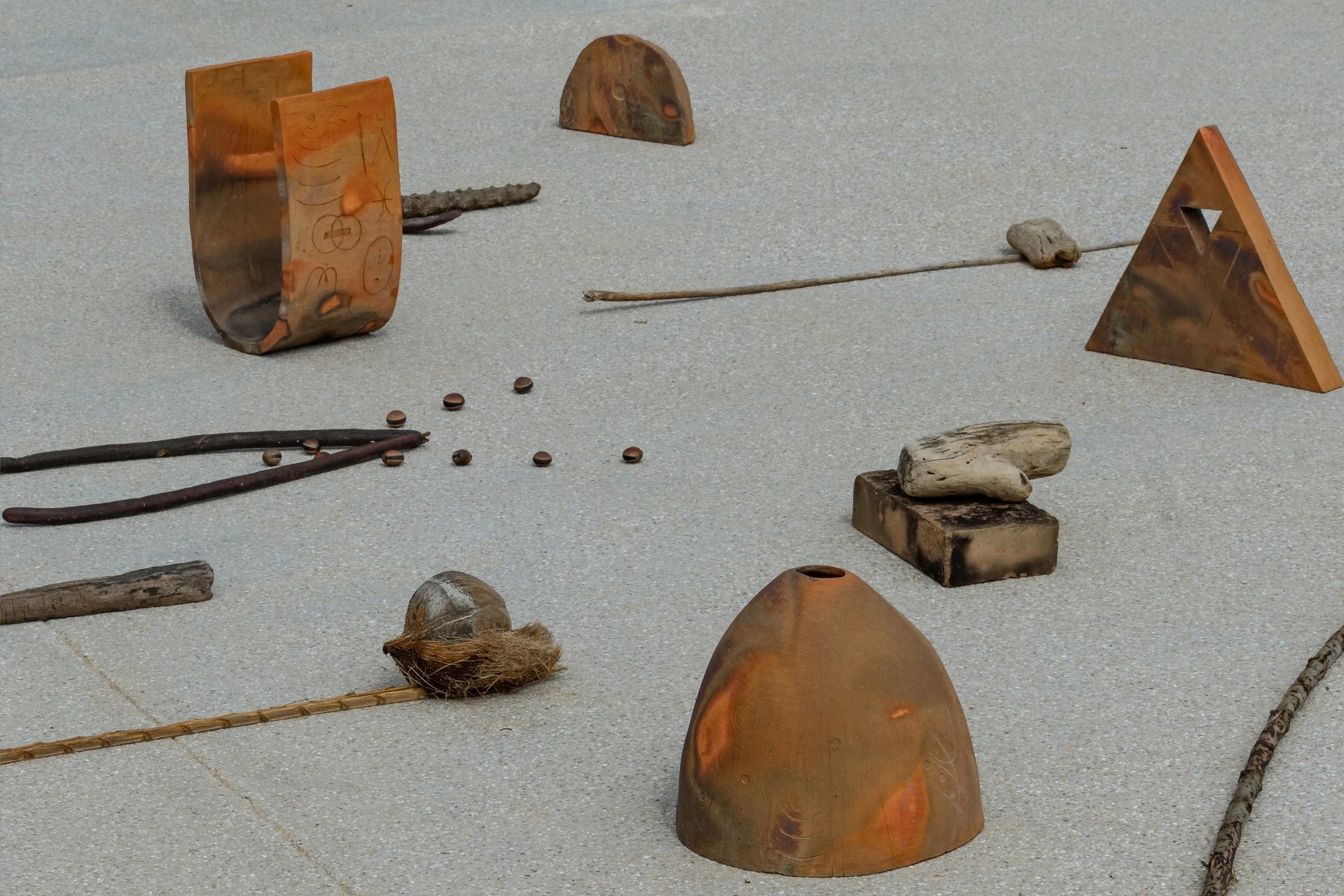 The sculptures are crafted from local clay and cooked a traditional Oaxacan oven using a firing technique that gives the clay a unique coloration of mottled red and black. Both the forms of the works and the diagrams inscribed on their surface tell a story. The delicate sculptures are intermixed with found objects such as seedpods, sticks and coconuts, giving both the sculptures and the natural objects the same importance. The installation forms a collaboration with nature to construct a temporary diagram of timelines flowing forwards and backwards through space.